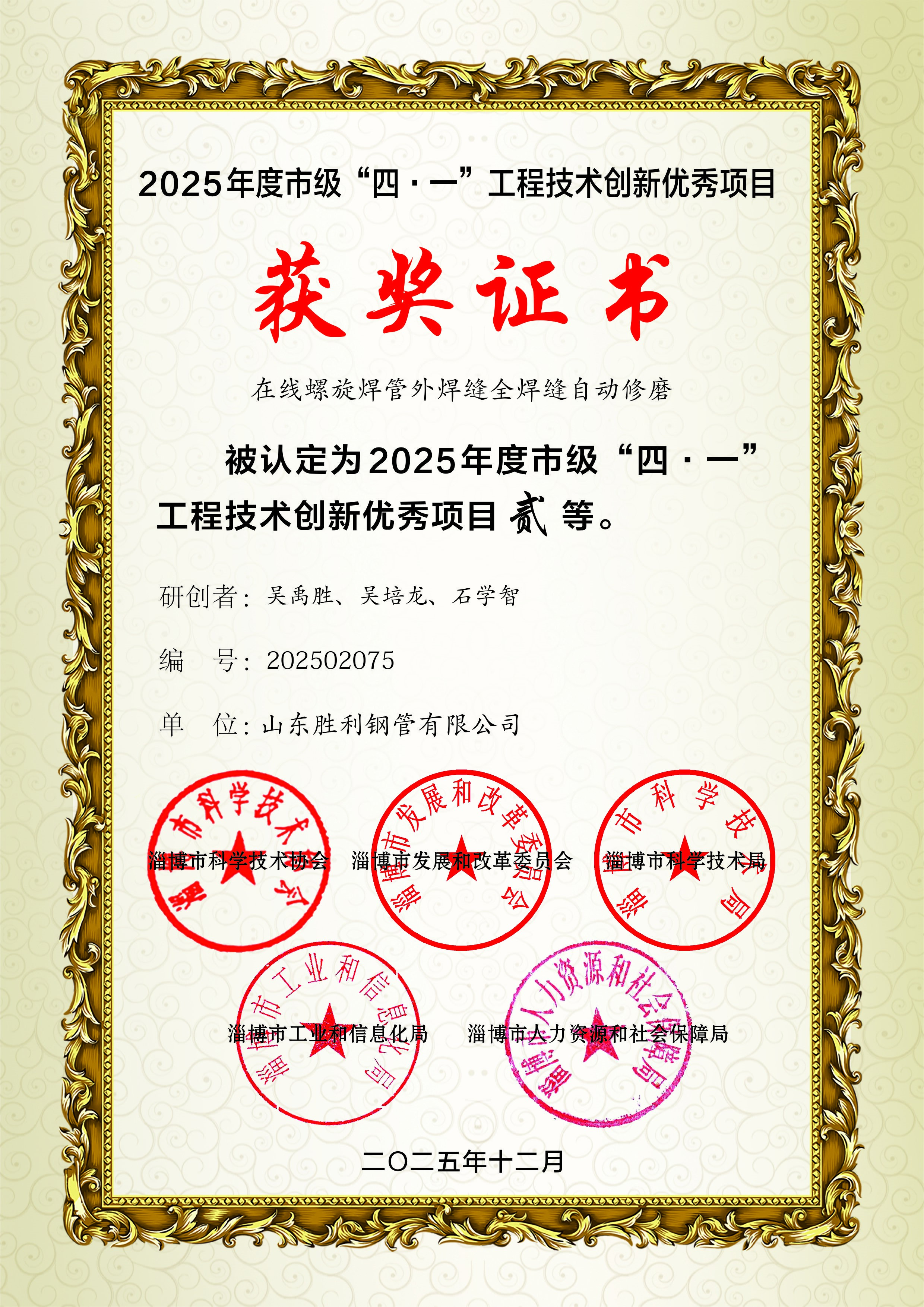 ? 近日,山東勝利的“在線螺旋焊管外焊縫全焊縫自動(dòng)修磨”項(xiàng)目榮獲 2025 年度市級(jí)“四 · 一”工程技術(shù)創(chuàng)新優(yōu)秀項(xiàng)目二等獎(jiǎng),此為近年來(lái)公司首次獲政府部門頒發(fā)的科技項(xiàng)目類獎(jiǎng)勵(lì)。